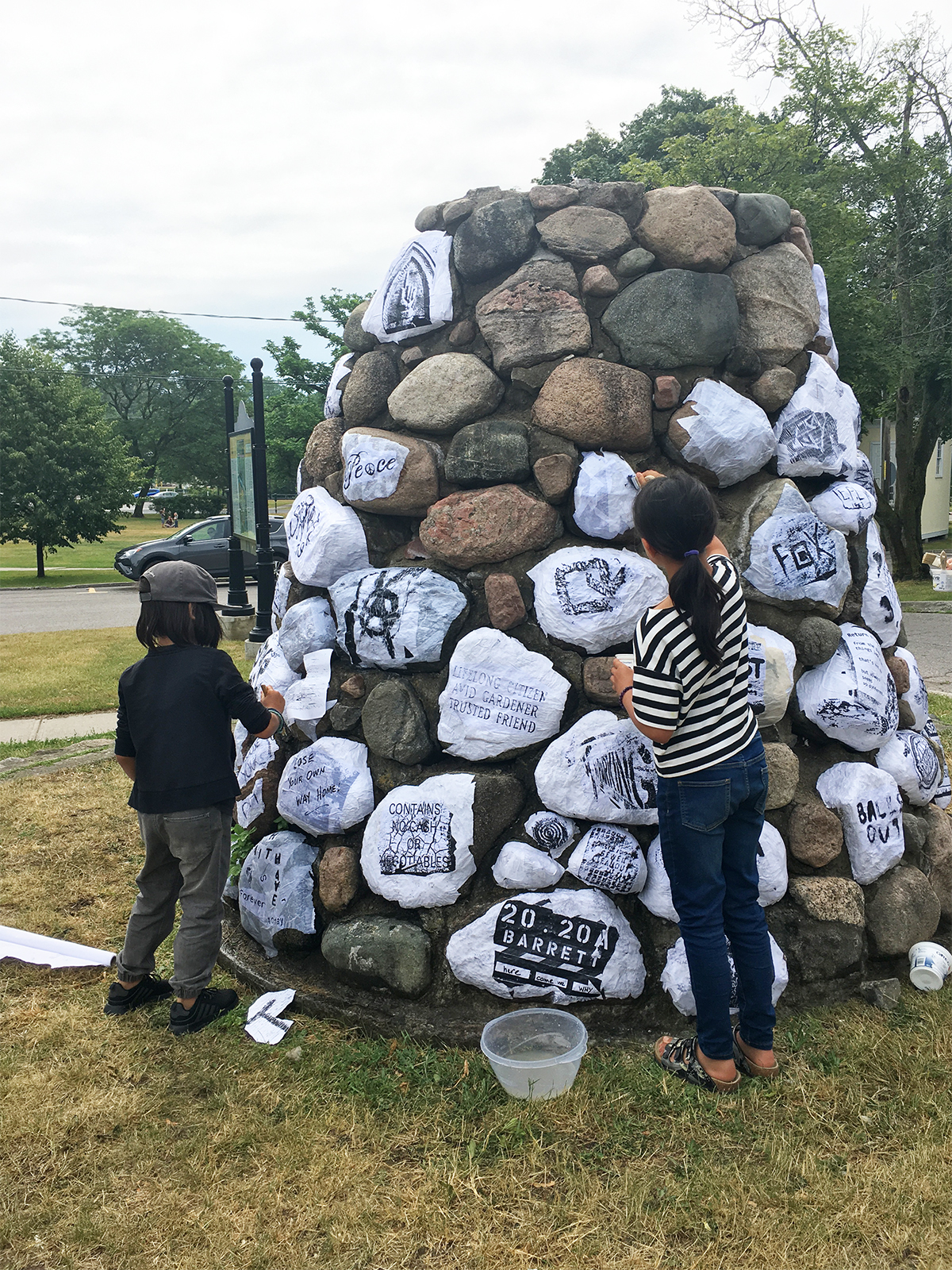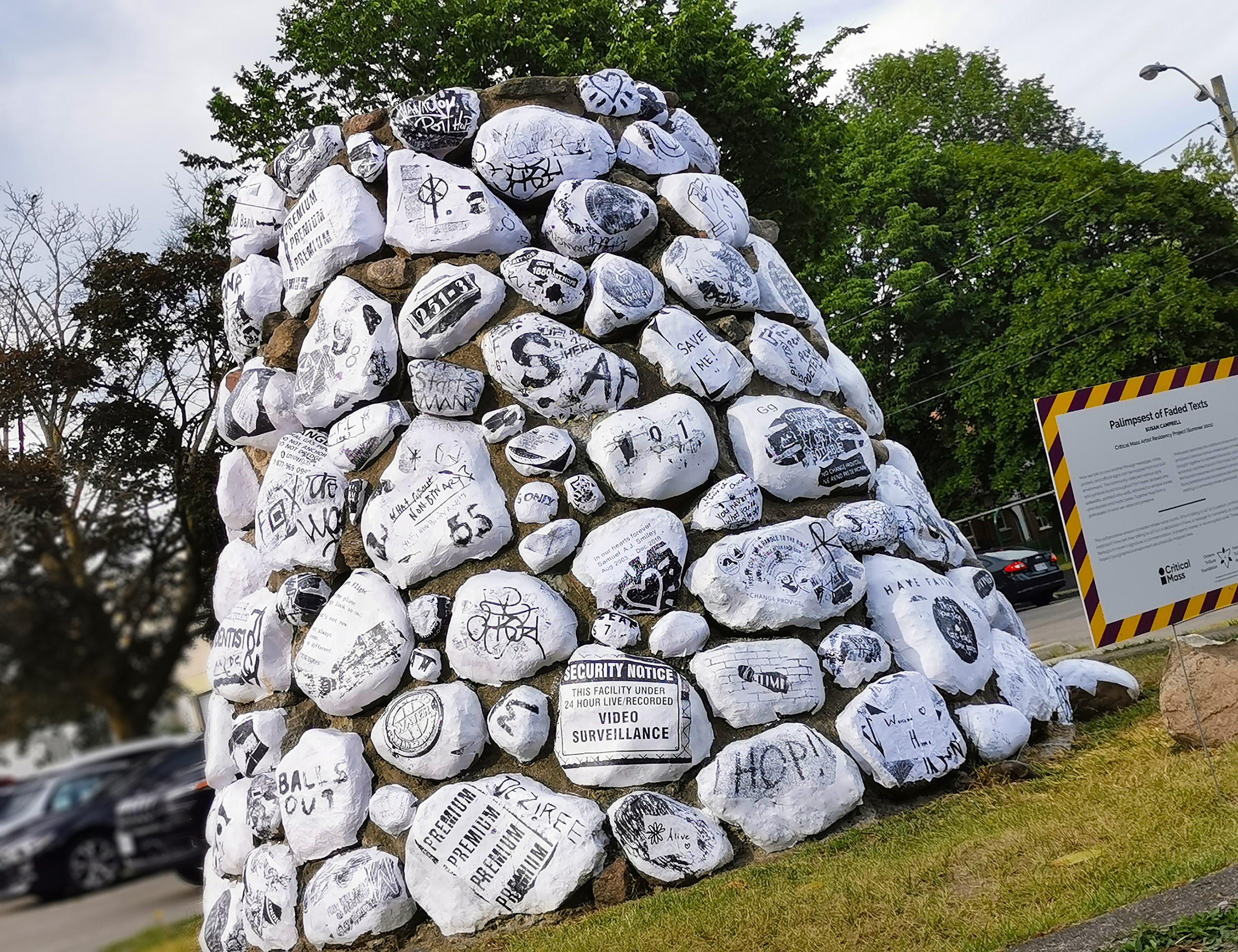 Palimpsest describes the additive process which produces a textual surface where layers of meaning are brought together to represent the social, cultural, and economic activities found in Port Hope, Ontario. Each boulder in the fountain becomes an individual canvas, upon which found letterforms and inscriptions are wheat pasted, creating a community-driven palimpsest.