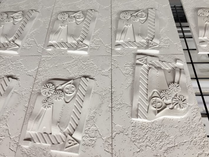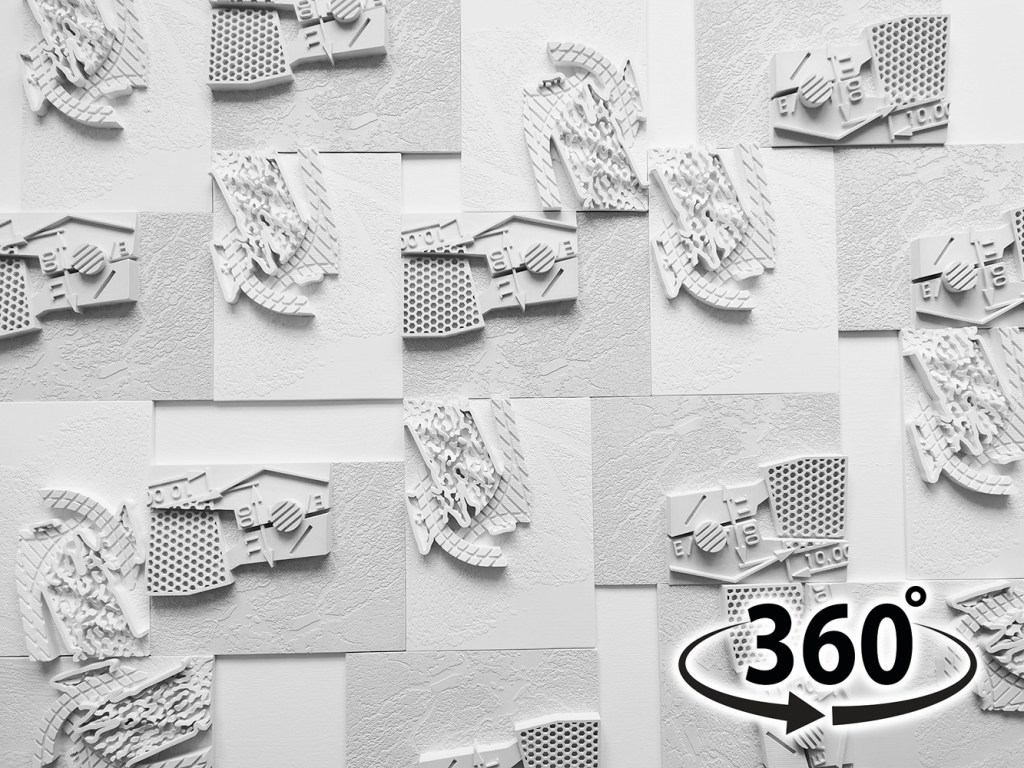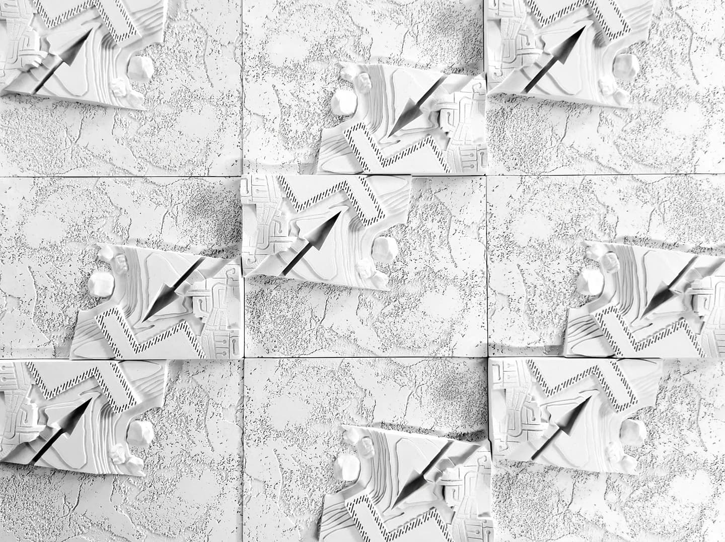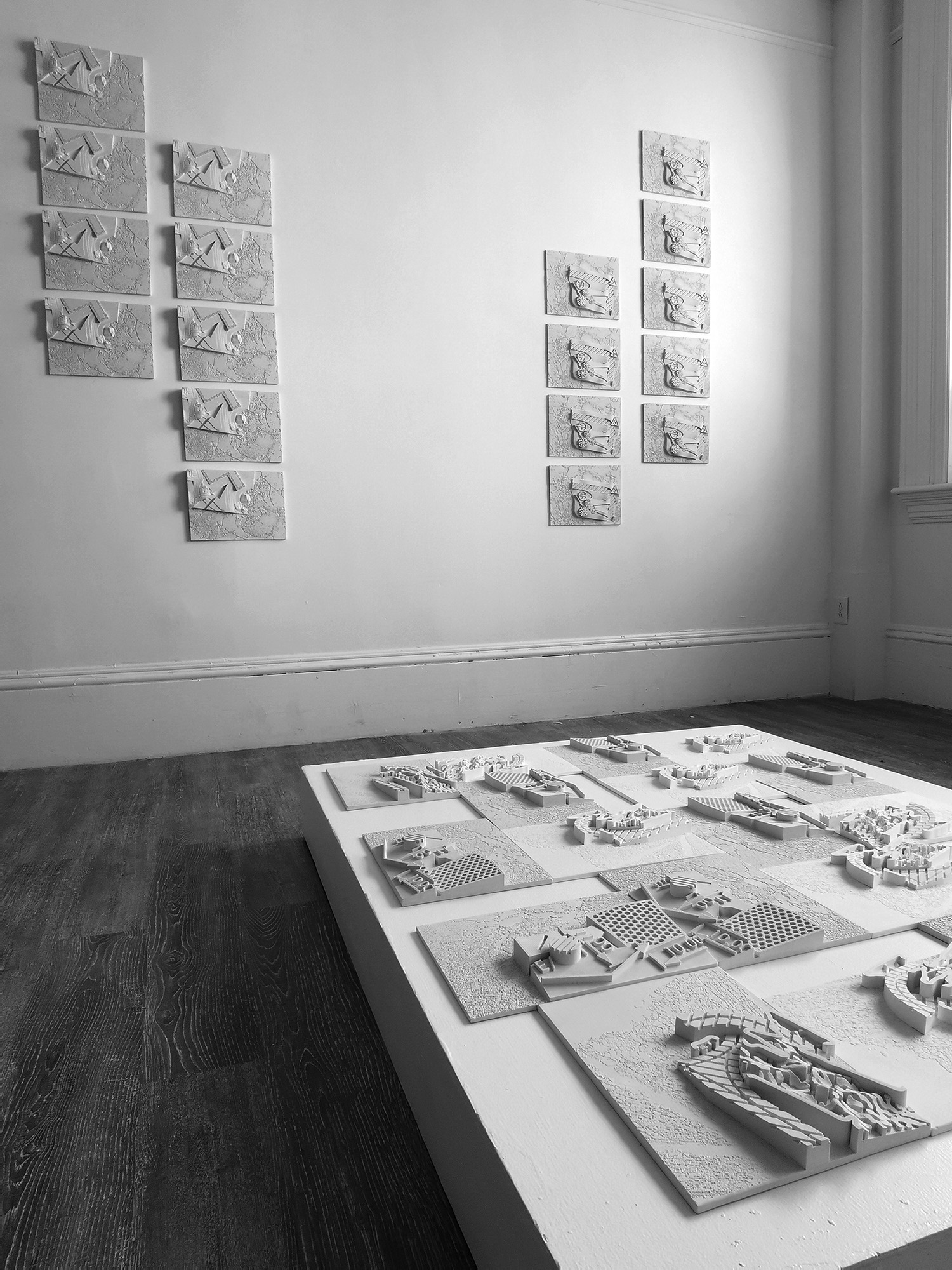 The uniformity and homogeneity of the gypsum reliefs (pictured above), molded from granite, asphalt, and concrete surfaces found in various topographic features represents the erasure of vacant land. The process of fabricating such reliefs allows me to envision a series of synthetic topographies where parametric architectures collide and overwhelm the surface. The gypsum reliefs are cast over and over again and arranged into a mass-assembly that conveys the relentless production cycle, colonizing every last square mile of available land and emulating the forces of late capitalism.